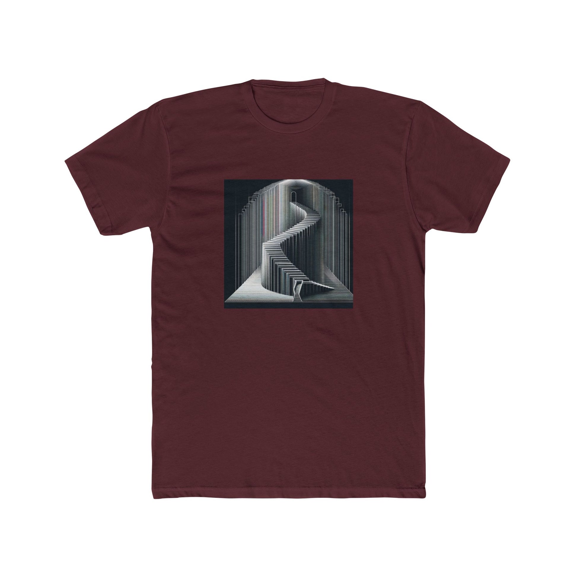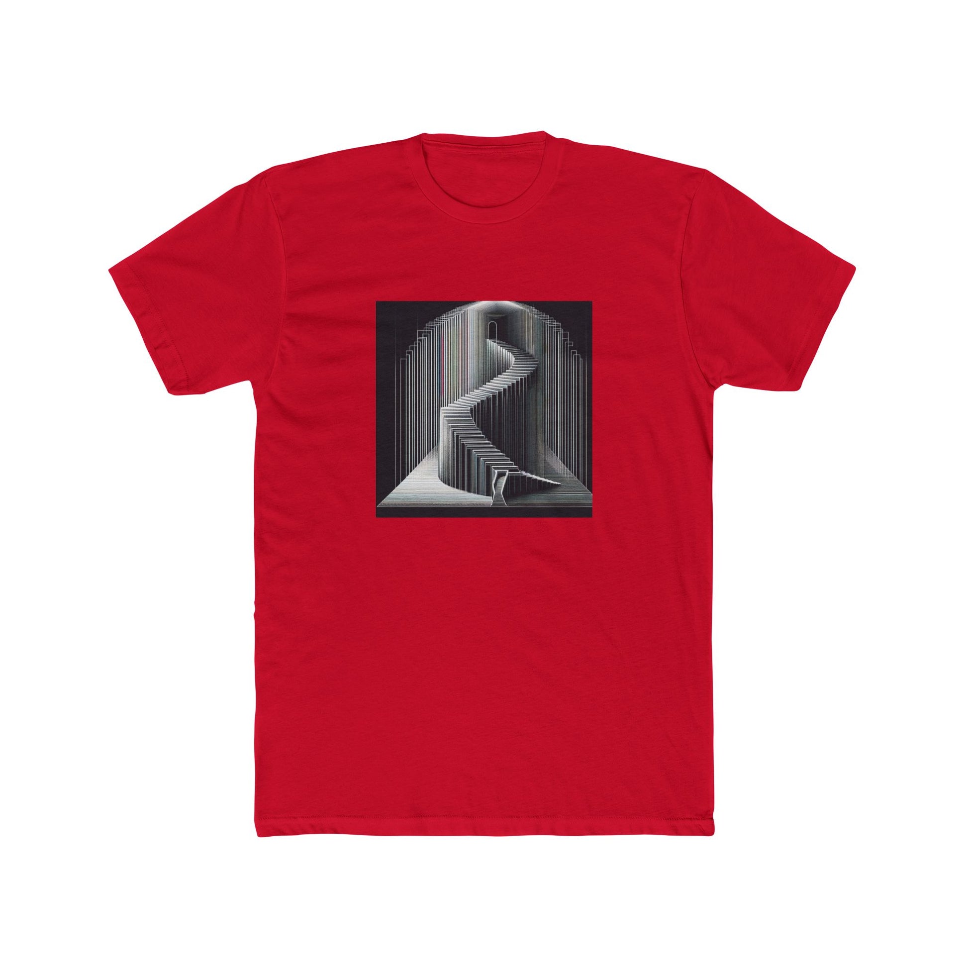 A unique step into the shadows: vector stairway art design on a premium t-shirt. Perfect for everyone! This unisex heavy cotton tee is ideal for adults and is made with high-quality materials for lasting comfort and durability. It is great for casual wear and can be a unique addition to any wardrobe, especially for those who enjoy holidays like Halloween or themed events.